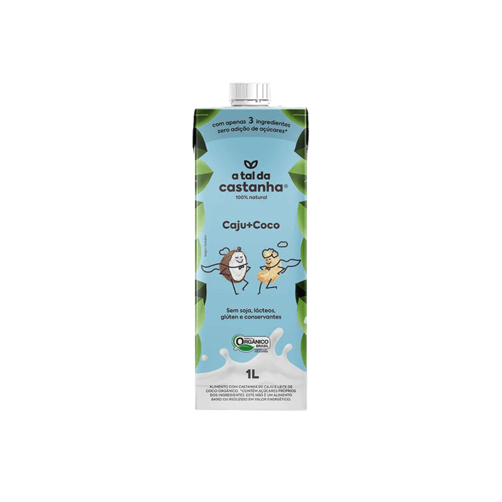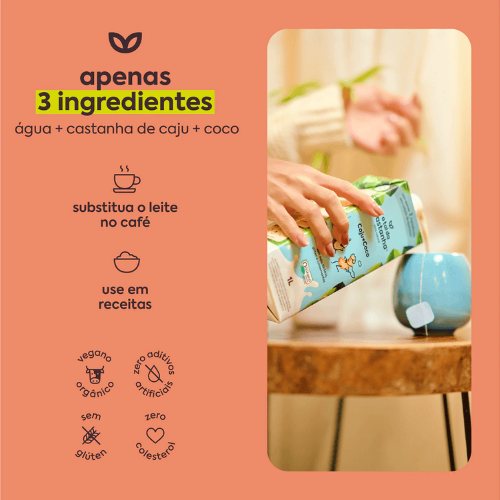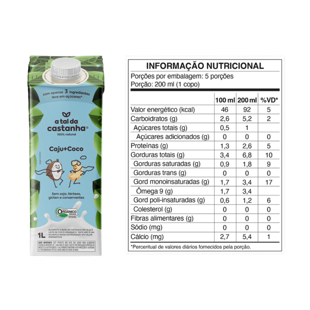 Bebida vegetal de castanha de caju e coco sem gomas, sem conservantes, sem adição de açúcares, sem adoçantes, sem aromatizantes e espessantes.