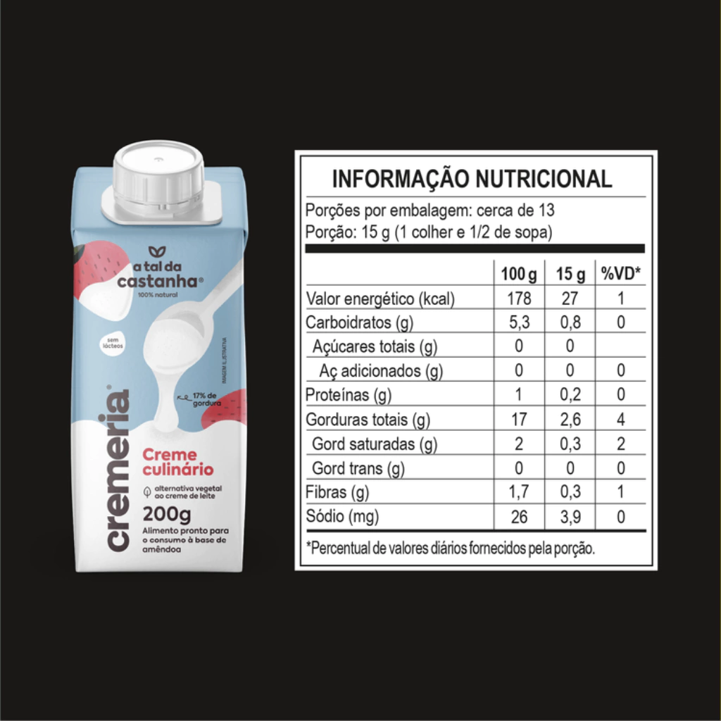 Novo lançamento A Tal da Castanha® o Creme Culinário Vegetal, alternativa vegetal ao creme de leite. O creme de leite vegano é 100% natural, sem lactose e à base de amêndoa. Resgate as suas receitas de família com minha nova linha culinária: Cremeria. Suas receitas mais tradicionais agora serão possíveis em versão 100% vegetal. Crie receitas doces ou salgadas, com cremes veganos e saborosos.