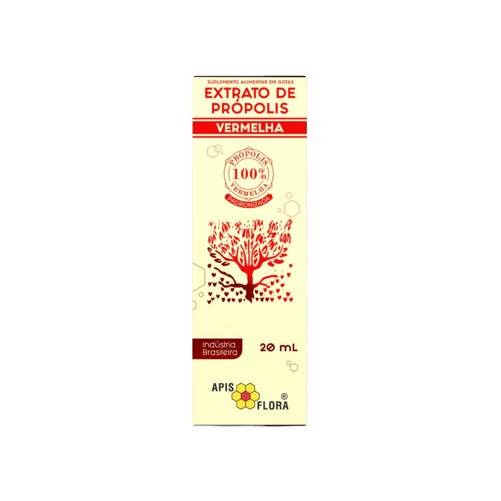 Extrato de Própolis Vermelha 20ml da Apis Flora, produzido exclusivamente com a própolis vermelha, que é obtida a partir das plantas nativas do Brasil, a Dalbergia ecastophyllum e a Symphonia globulífera, cujos nomes populares são rabo-de-bugio ou marmelo do mangue para a primeira espécie, e anani ou guanandi para a segunda.