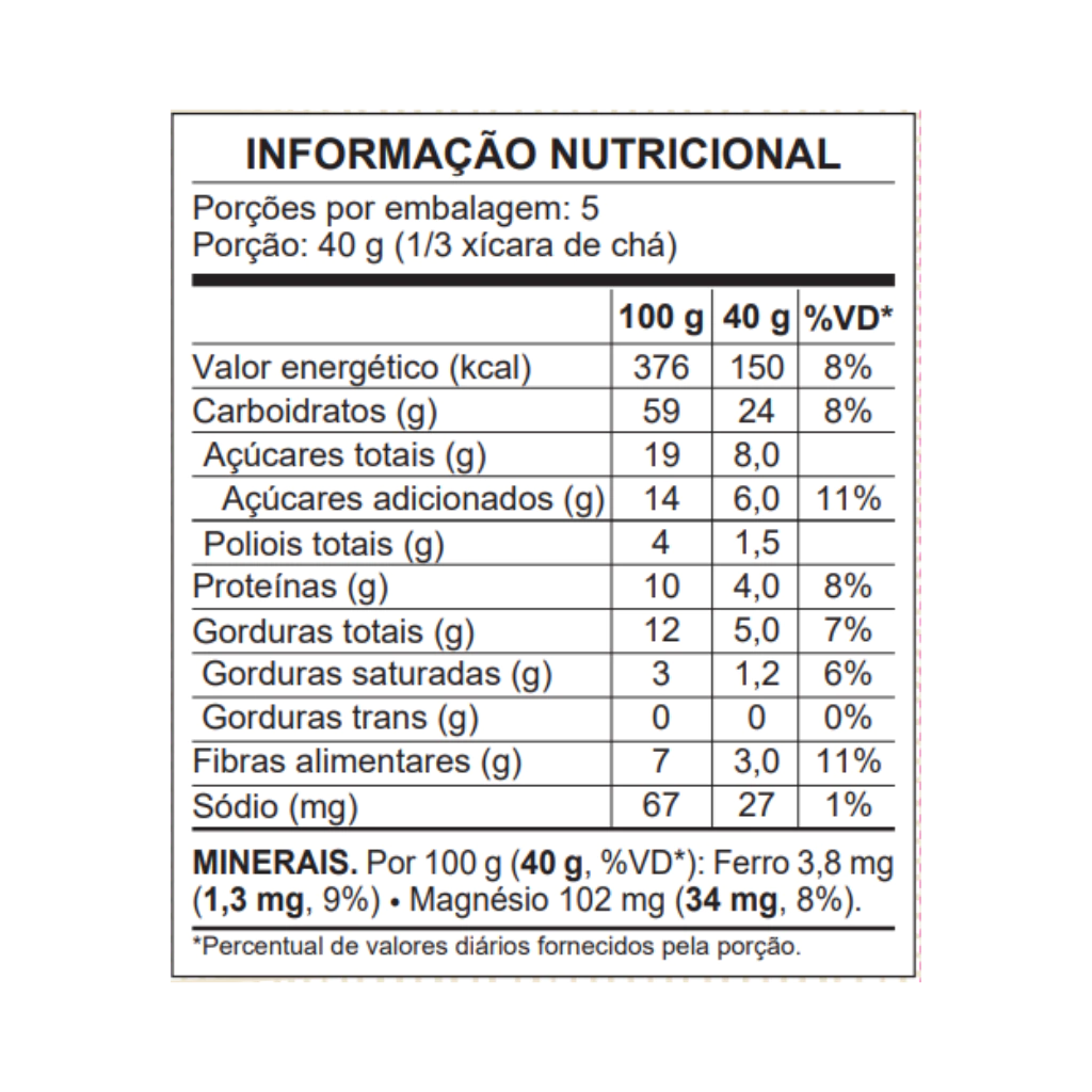 INGREDIENTES: Aveia em flocos, melado de cana, farinha de arroz, uva passa, açúcar mascavo, castanha-de-caju, coco ralado, óleo vegetal, gergelim, linhaça, chia, sal marinho e estabilizante: maltitol.